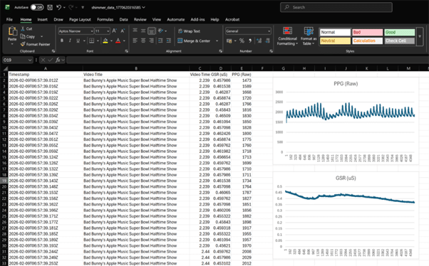 Below is a short demonstration of the extension running while a YouTube stream of the Super Bowl Halftime Show is playing. The video shows biometric data being recorded in real time while playback continues normally. The companion panel updates continuously as the video progresses, illustrating how physiological responses can be mapped directly to specific segments of the performance